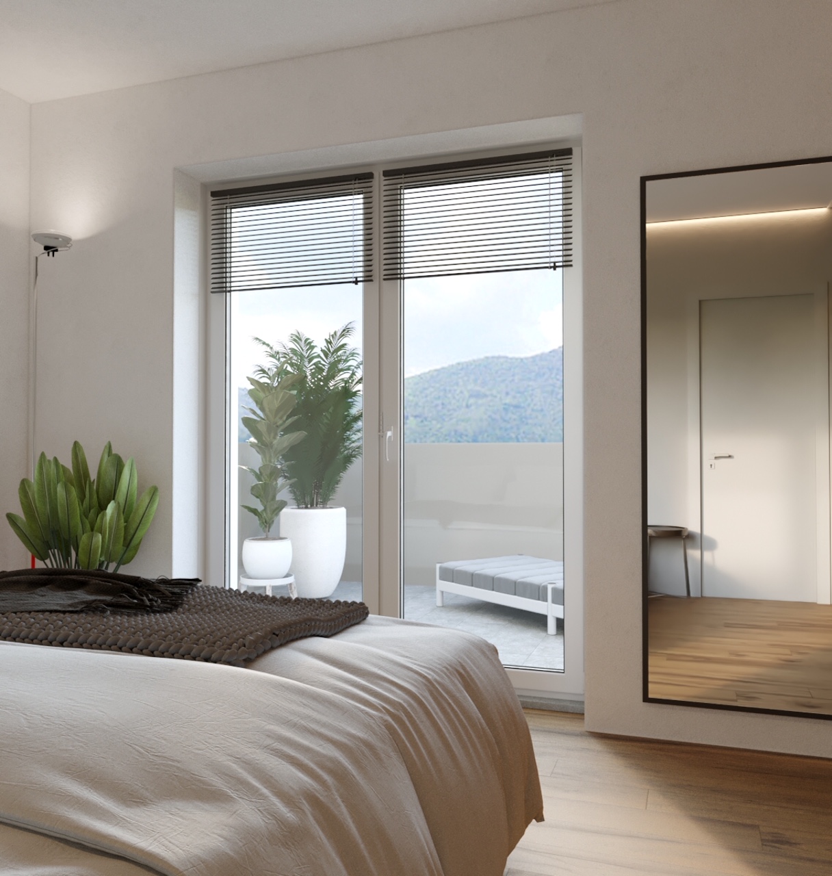 – oscuranti elettrici frangisole ed illuminazione controllati da un impianto base di domotica.